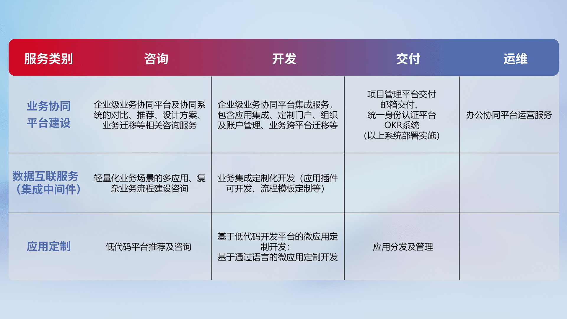 针对钉钉、、、、企微、、、、IDaas等平台级产品提供产品的规划、、、方案、、、、交付、、、定制化开发等服务,,,实现如统一协同办公、、智能客户服务、、、混合会议管理、、智能数据查询、、、、等业务场景,,,,实现数字化转型。。。。
